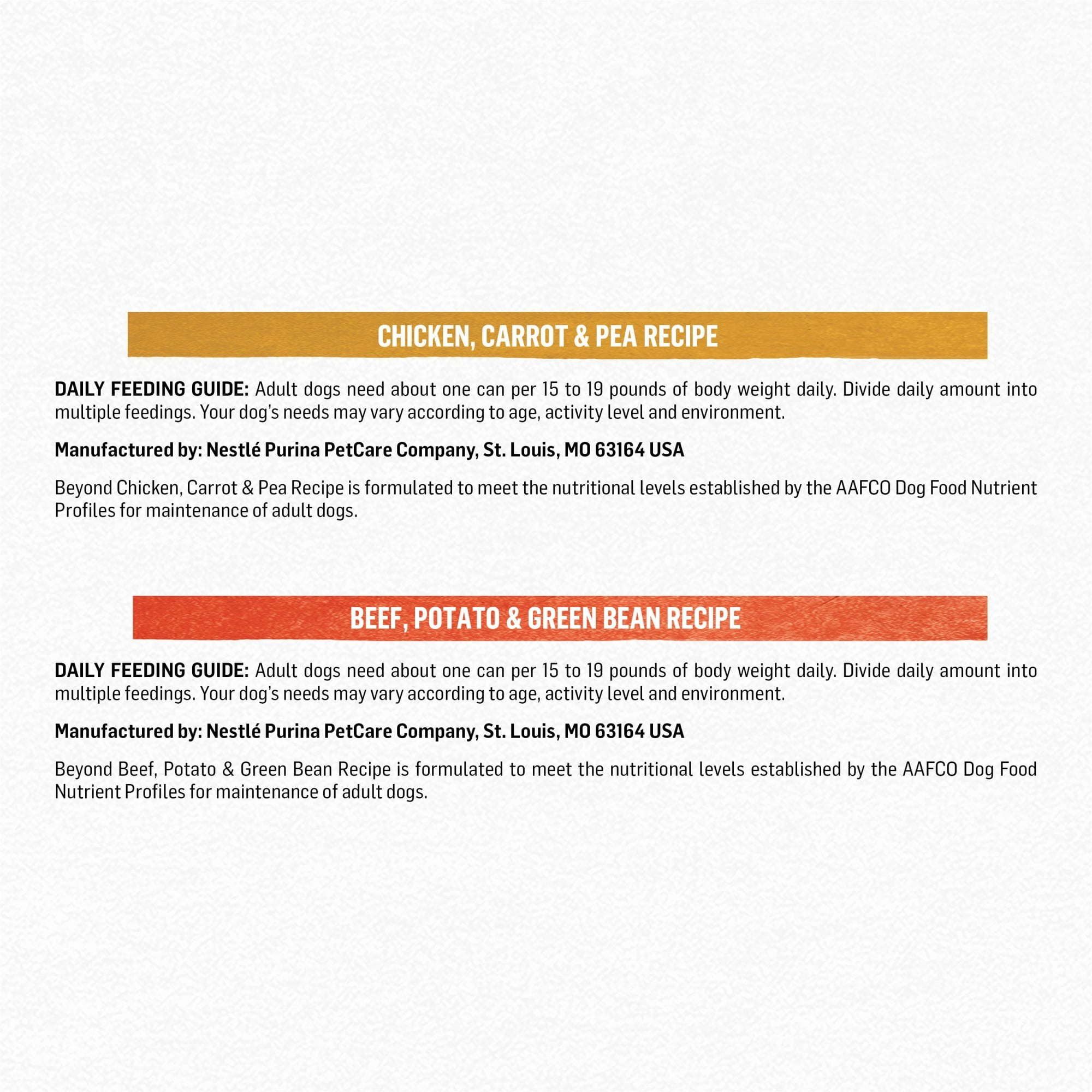 Give your dog a variety of grain-free mealtime options with this Purina Beyond Grain Free Ground Entrees adult wet dog food variety pack. Each entree contains real, recognizable ingredients from our trusted sources and includes natural prebiotic fiber in every recipe. Our varieties start with farm-raised Texas beef (Texas-raised for a minimum of 100 days), Alaskan cod from an MSC-Certified fishery or real chicken raised without steroids or hormones* as the #1 ingredient. With wholesome vegetables like carrots and peas, this natural dog food plus added vitamins and minerals gives your dog the nutrition he needs to thrive in a complete and balanced meal. We craft our wet dog food pate with no corn, wheat or soy and include no poultry-by-product meal or artificial colors, flavors or preservatives. Give your dog grain-free, high-protein dog food with the three delicious selections in this Purina Beyond variety pack. *Federal regulations prohibit the use of steroids or hormones in poultry.
